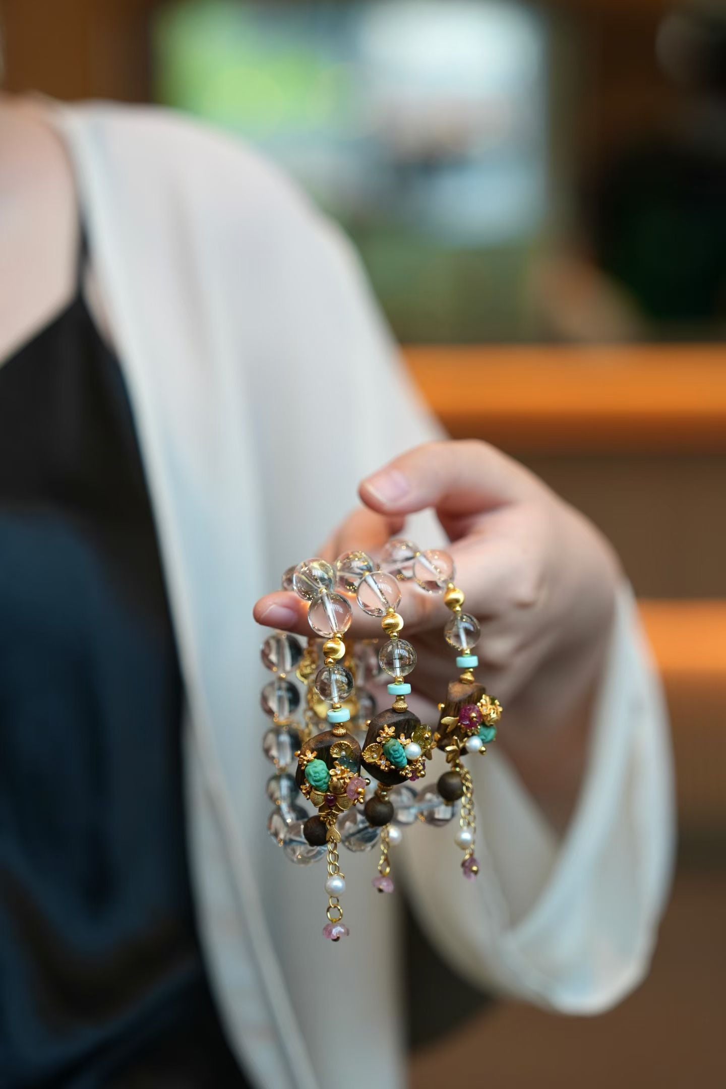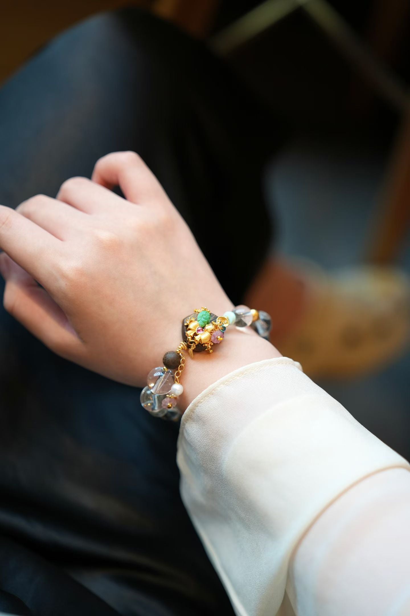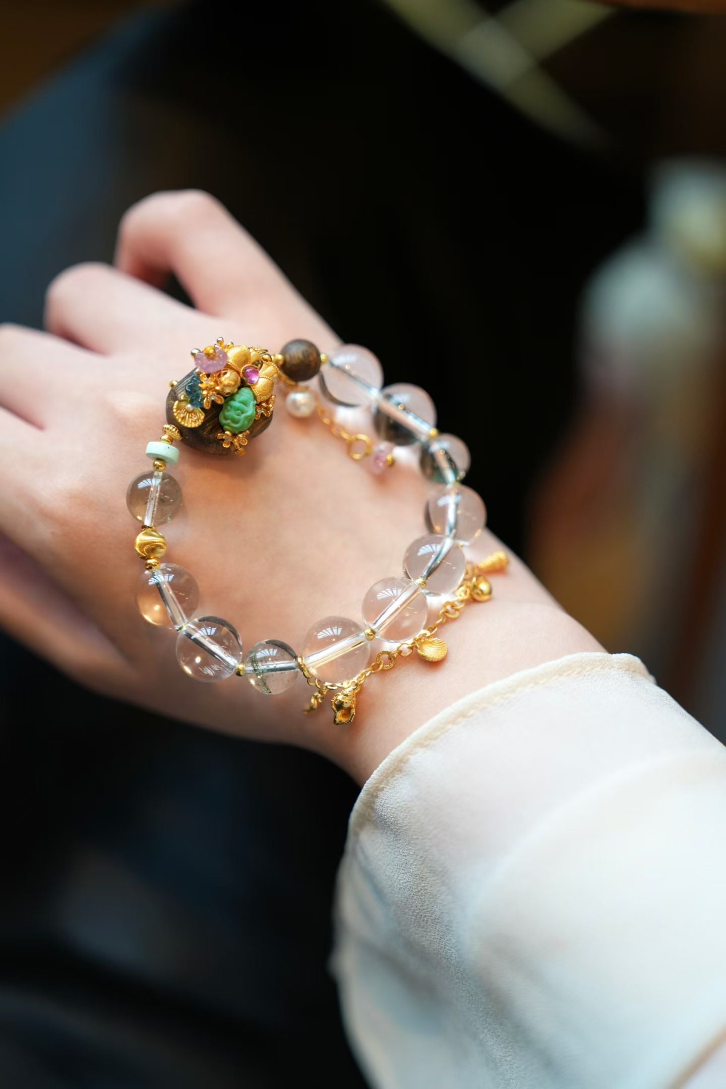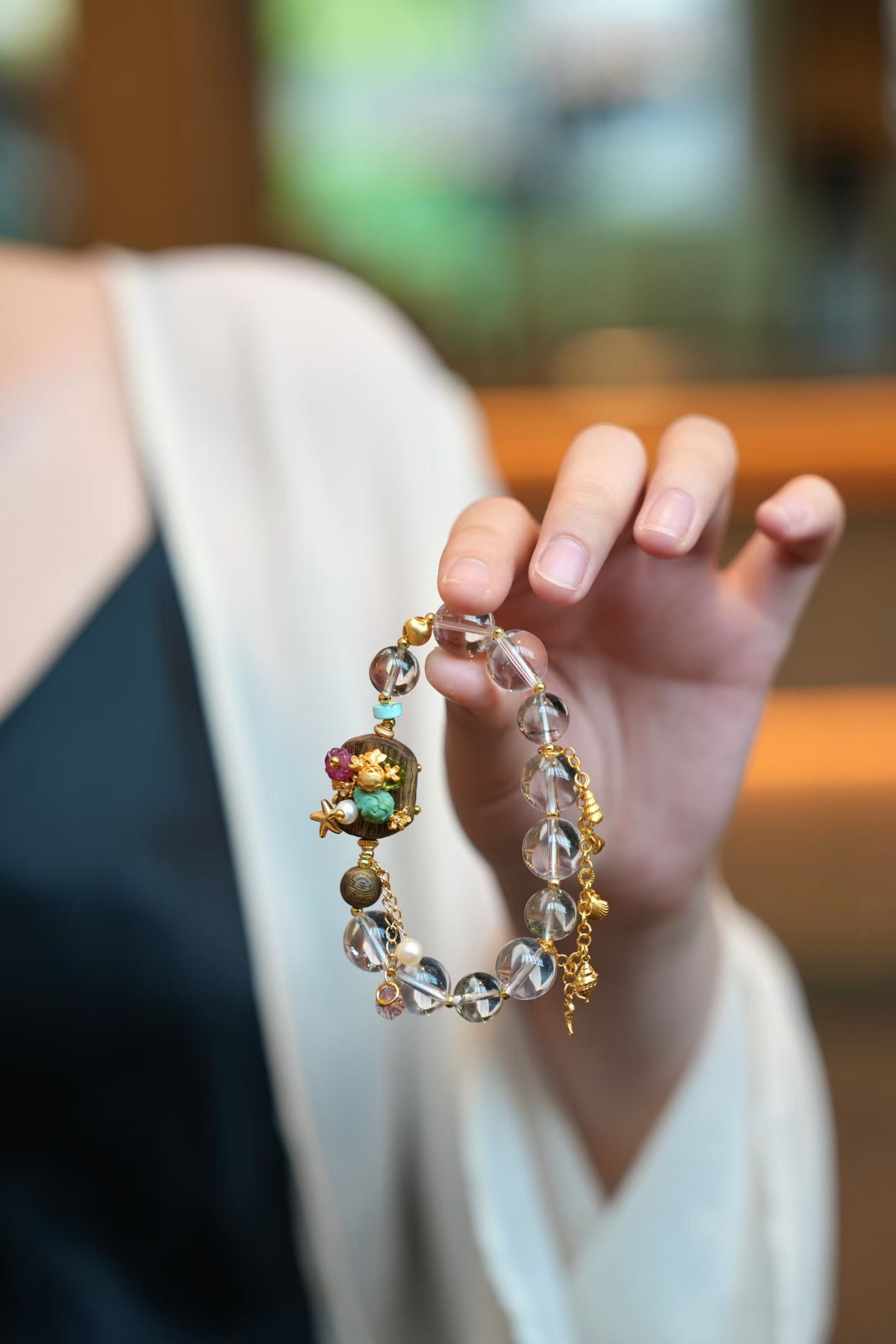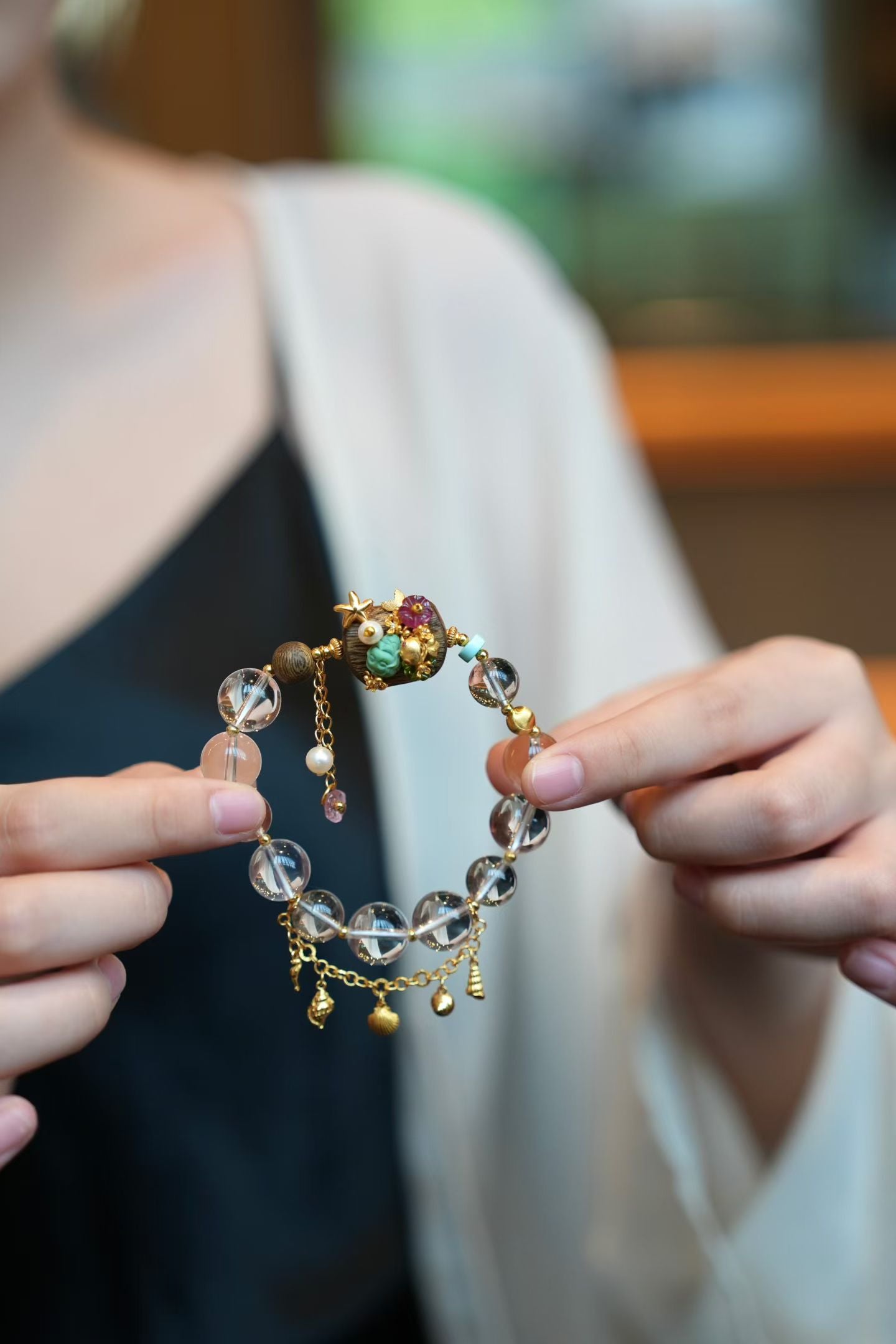 Featuring pure, water-like clear crystal and Green Phantom "planet" beads. Paired with a hand-inlaid agarwood plaque and turquoise tourmaline. 🌸 "Mermaid's Underwater World" silver edition design. Wearing it gives a lively, fairy-like beauty with a touch of adorable innocence.